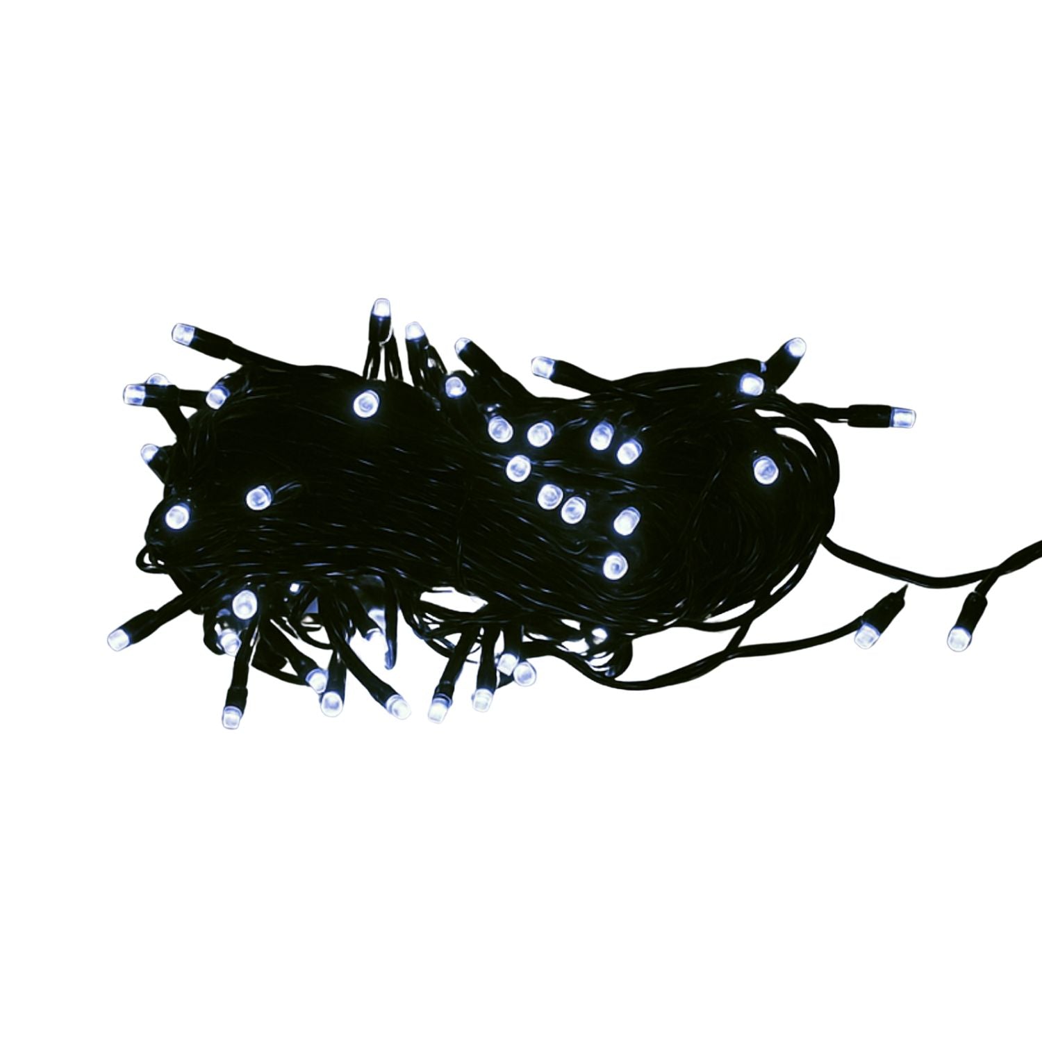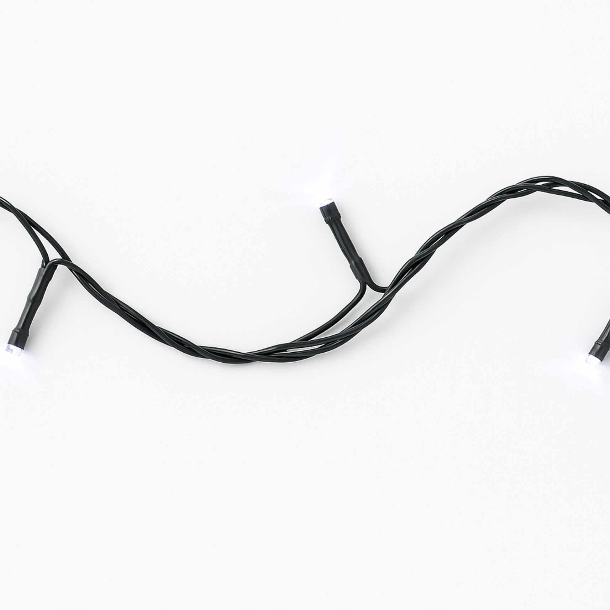 - 100 LED white string lights with green wire and waterproof plug-in design offer classic indoor/outdoor lighting for holiday or party displays.