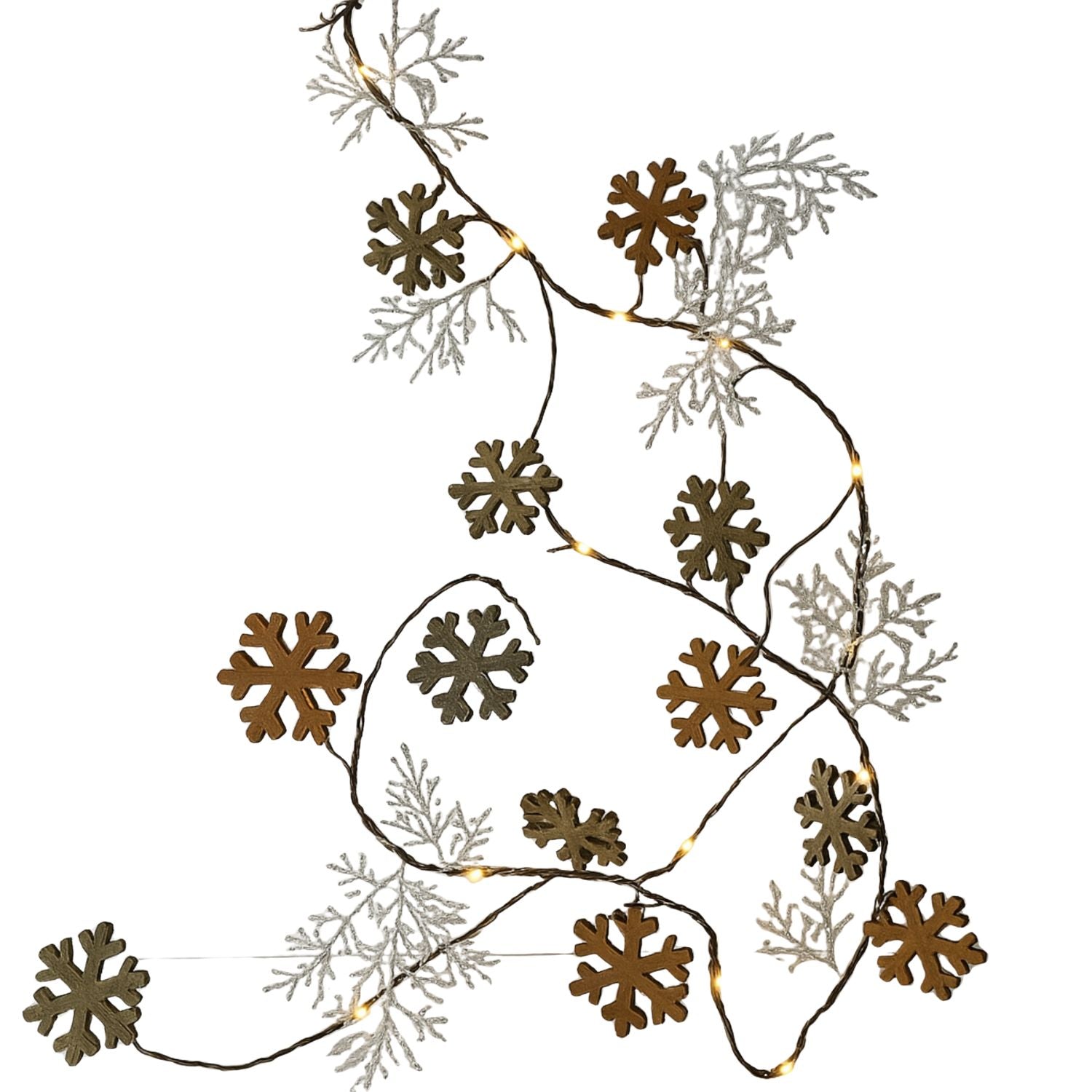 Add a touch of holiday magic to your space with this 7.5-foot glitter snowflake string light. Featuring 20 warm white LED lights on a natural twine-wrapped copper wire, this garland is adorned with 16 large silver glitter snowflakes and 30 small glittered wooden snowflakes for a beautifully layered festive look. Whether wrapped around a holiday wreath, placed along a mantel, or styled as part of a winter table centerpiece, this decorative light brings warmth and shimmer to your seasonal décor. The flexible design makes it easy to hang or shape to fit any indoor holiday display. (Batteries not included)