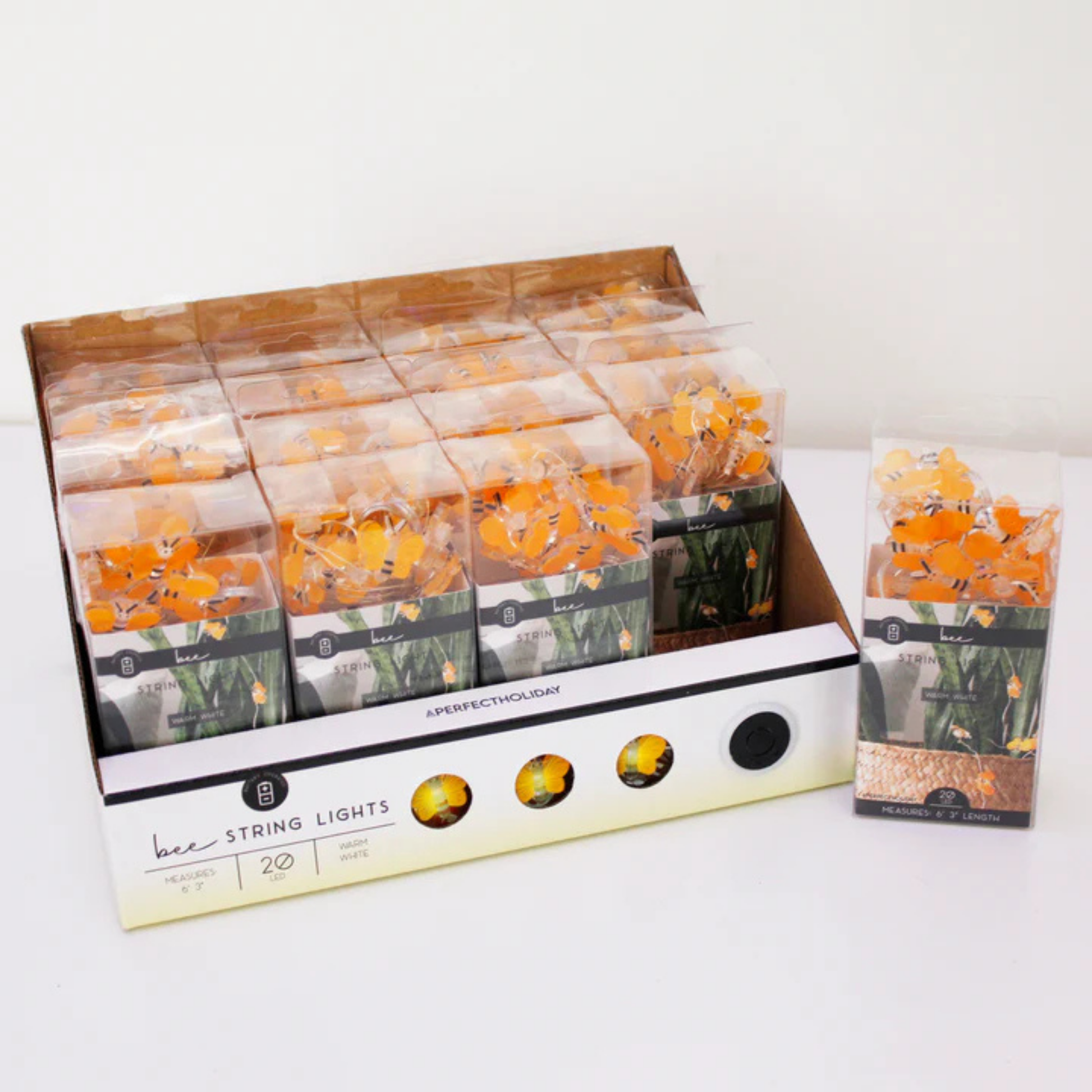 Add a cheerful glow to any space with these 20 LED Bee String Lights. Each warm white micro dot light is tucked into a tiny bee shape for a fun and cozy effect. Measuring over 6 feet long, these string lights are battery operated and ideal for bedrooms, parties or crafting a playful accent in small spaces. Whether draped over shelves, wrapped around a mirror, or added to a gift display, this light set brings a whimsical charm to your décor. The included PDQ display contains 16 units, perfect for retail or event use. Indoor use only.